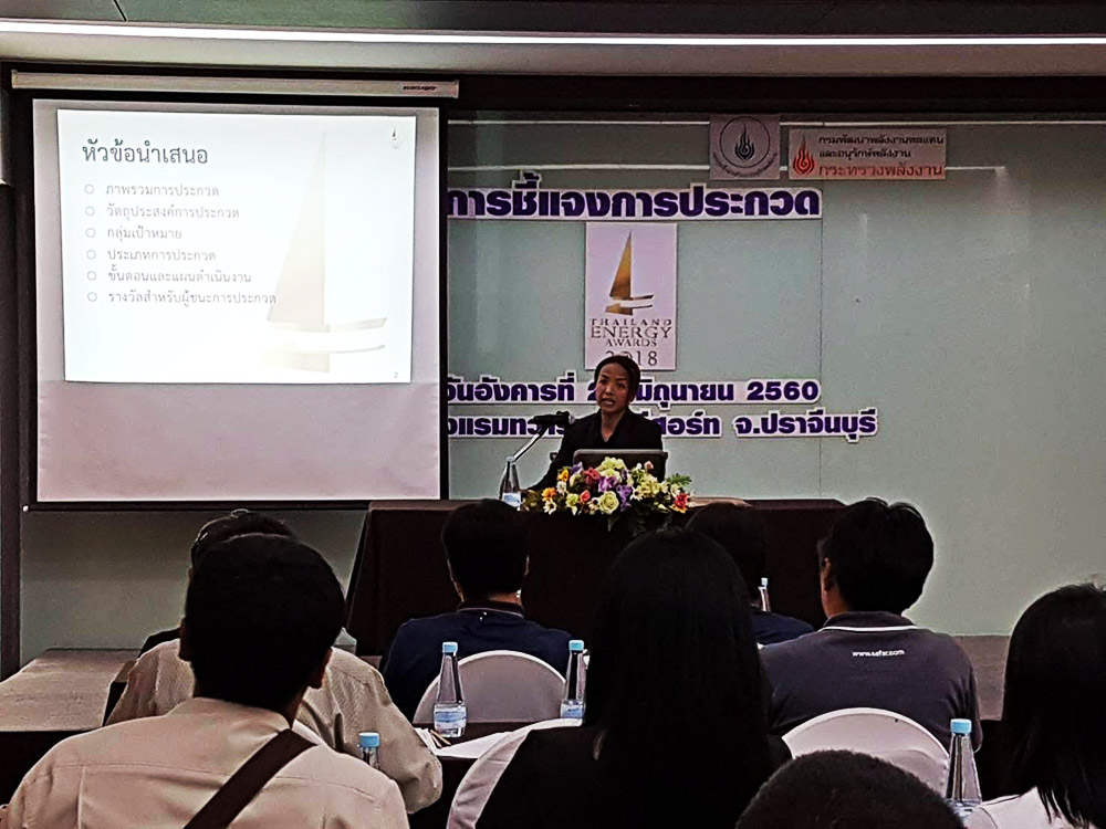 กรมพัฒนาพลังงานทดแทนและอนุรักษ์พลังงาน (พพ.) เดินหน้าชี้แจงหลักเกณฑ์การประกวด Thailand Energy Awards 2018 โดยวันนี้เป็นการชี้แจงหลักเกณฑ์การประกวดในรอบแรกที่โรงแรมทวารวดี รีสอร์ท จังหวัดปราจีนบุรี ทั้งนี้เพื่อให้ทราบถึงหลักเกณฑ์การประกวด รวมทั้งเป็นการส่งเสริมภาคธุรกิจ อุตสาหกรรม ให้ตื่นตัวในการอนุรักษ์พลังงาน และผลักดันให้เกิดการพัฒนาพลังงานทดแทนมากยิ่งขึ้น โดยวันนี้มีหน่วยงานและพี่ที่สนใจเข้าร่วมรับฟังการชี้แจงอย่างคึกคัก